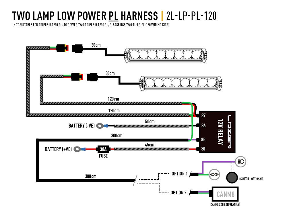 In jedem Satz sind ein Relais, Sicherung, Schalter und zusätzlich wasserdichte Kabelverbinder enthalten, damit Sie die Lazerlamps sicher mit der vorhandenen Fahrzeugelektrik verbinden können. Die Umrissleuchten werden zusammen mit dem Standlicht geschaltet und die Fernscheinwerferfunktion mit dem Fernlicht.