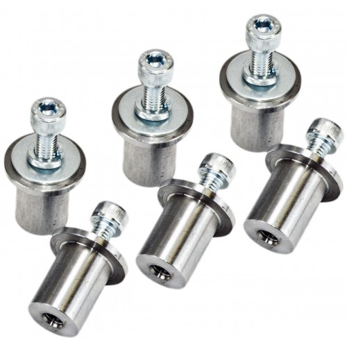 Das Set beinhaltet sechs Stahbuchsen mit Schrauben und Sicherungsringen. Zur Montage wird an den entsprechenden Stellen ein 21mm Loch gebohrt und die Buchsen eingeschweißt. Unterhalb der Buchsen sind auf jeden Fall noch ausreichend große Bleche einzuschweißen um die Last der Pedalerie möglichst großflächig zu verteilen.