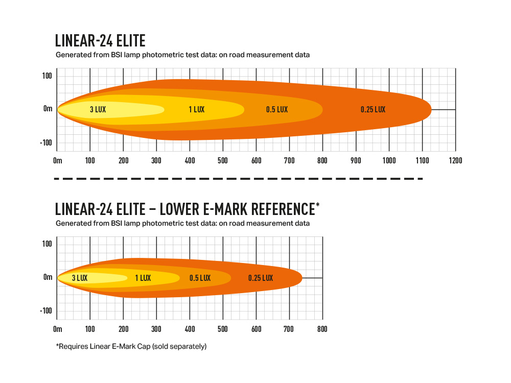 Der Linear-24 Scheinwerfer verfügt über hocheffiziente 3 Watt LED die zusammen eine Lichtleistung von 18000 Lumen haben. Der 1 Lux Lichtkegel reicht bis auf fast 600 Meter wobei die Lampe nur eine elektrische Leistung von 188 Watt benötigt. Die Lichtverteilung ist sehr breit ohne an Leuchtweite zu verlieren, damit leuchtet sie auch den Fahrbanhnrand sehr gut aus. Wohin im Vergleich zu den ST oder Triple-R Scheinwerfern die Lichtverteilung in der Höhe stärker gebündelt ist. Damit ist der Linear Scheinwerfer sowohl für eine tiefe Montage, z.B. im Kühlergrill oder auf dem Nummernschildhalter, als auch für die Dachmontage geeignet.
